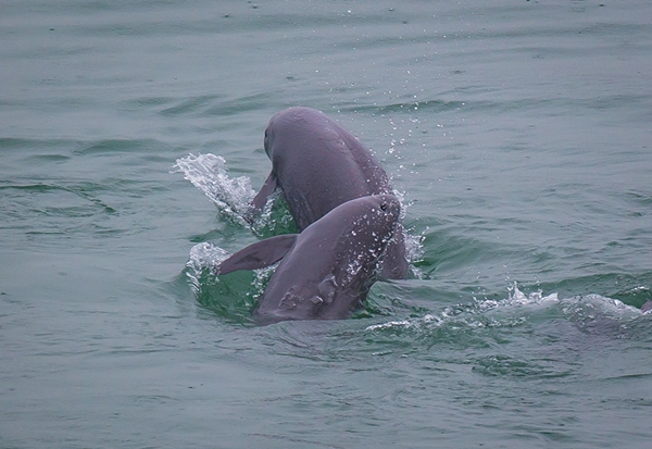 2021年5月10日,在湖北宜昌江边,长江江豚在水中嬉戏。
