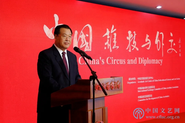 7月20日,“中国杂技与外交”图片展览在中国文艺家之家展览馆开幕。图为中国文联副主席、中国杂协主席边发吉致开幕辞。