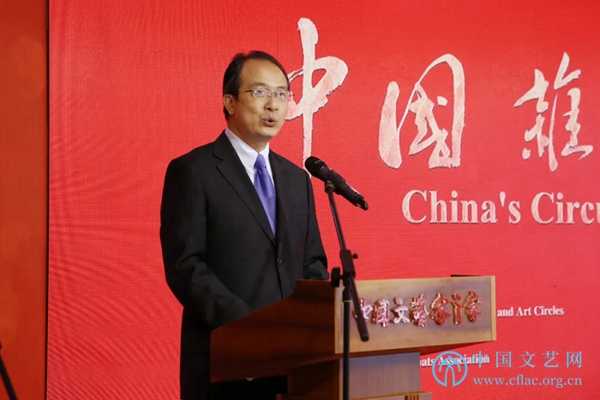 7月20日,“中国杂技与外交”图片展览在中国文艺家之家展览馆开幕。图为外交部礼宾司司长洪磊致辞。