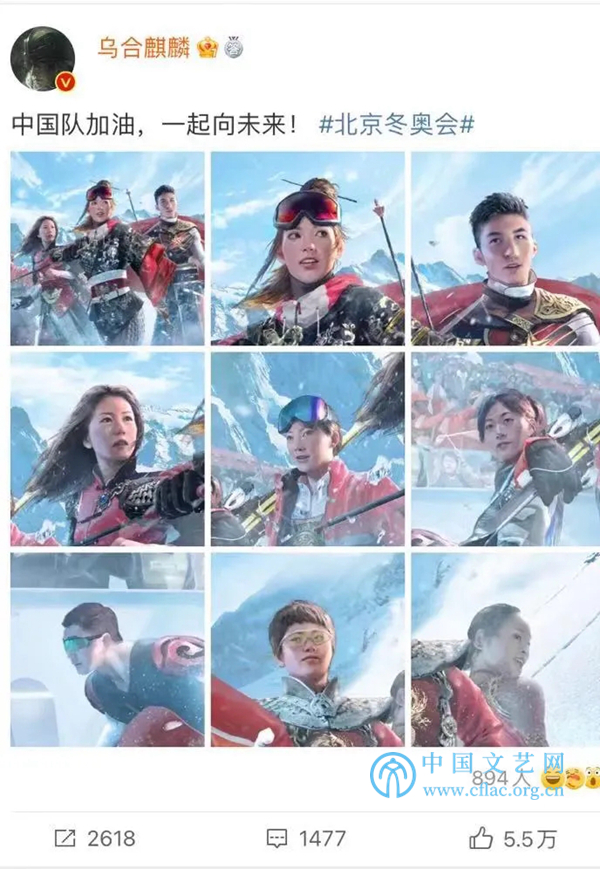 #中国队加油,一起向未来#乌合麒麟冬奥主题插画 蔚蓝天空中龙形的云影;女子自由式滑雪运动员谷爱凌造型中的花木兰元素;男子短道速滑运动员武大靖身披飞扬的红色战袍;短道速滑“大魔王”王濛的铠甲元素……以及,运动员背景后的防疫人员、医护工作者、环卫工人、保安等
