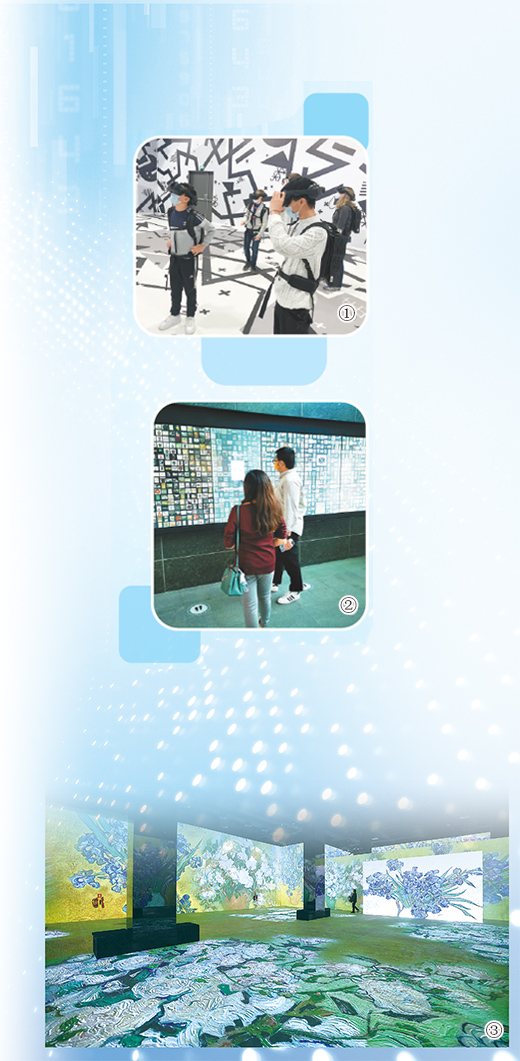 图①:在法国巴黎拉德芳斯新凯旋门,游客借助虚拟现实设备参观“永恒的巴黎圣母院”虚拟沉浸式展览。
