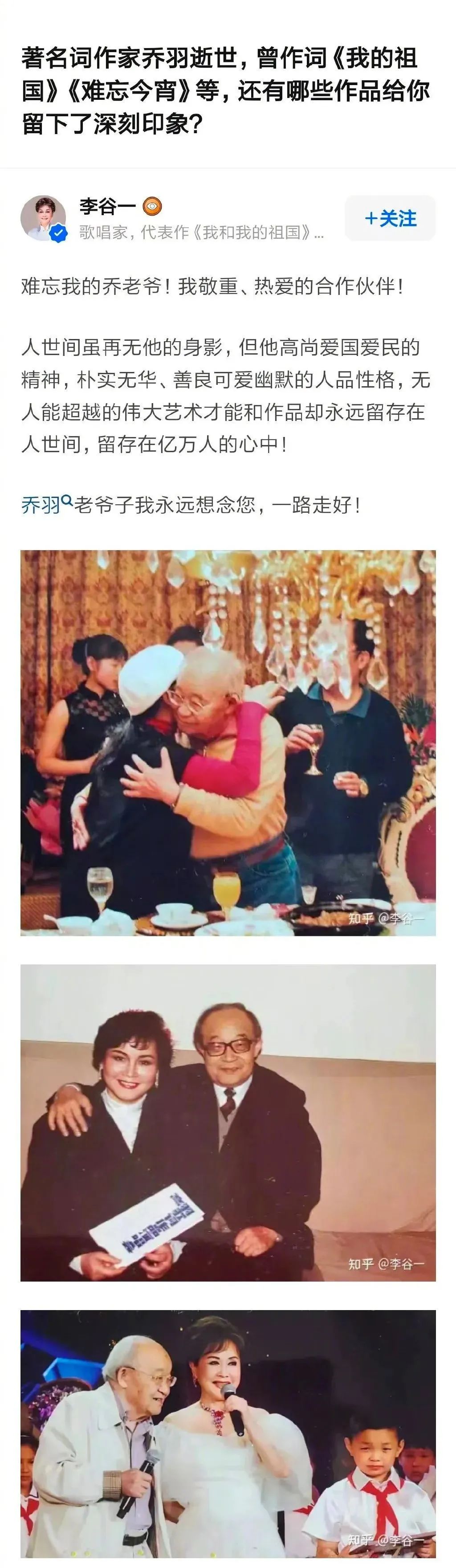 乔羽逝世后,李谷一第一时间在知乎平台发文,深情缅怀乔羽先生。