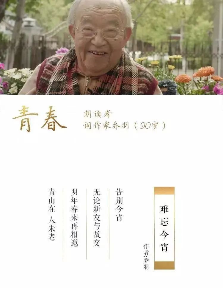 2017年,在央视综艺节目《朗读者》第一季结束时,已是鲐背之年的乔羽和七位德高望重的文艺家一起献声,用特别的方式诠释青春的模样,此时,《难忘今宵》中的经典歌词再次回荡在人们心中。“青春就是年轻的时候,哈哈。”乔羽说。