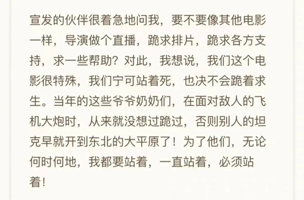 “我希望把这些老人的故事搬上大银幕,让更多人看到,70多年前,有那么一群人曾用生命和鲜血为我们筑起一道保护墙。对于那场战争,我们了解得太少,对于那场战争里的‘人’,我们更是所知不多。那场战争不仅仅是爱国精神的胜利,更是中国人乐观、不服输的民族精神的胜利。”