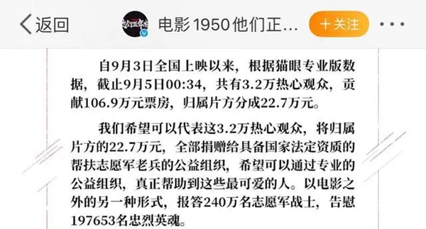 当天,话题“1950他们正年轻票房捐老兵”登上热搜,阅读量近3000万人次。