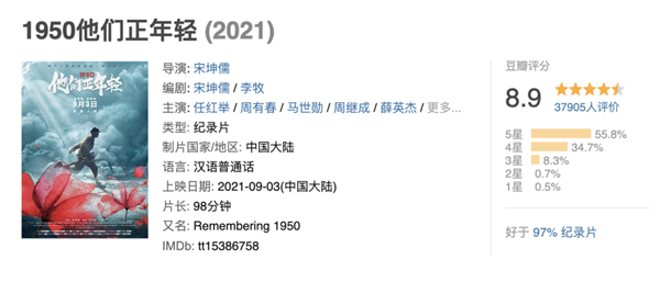 此后,越来越多的年轻人化身为“自来水”,在社交媒体上为《1950他们正年轻》卖力打call,留下真实的打分,自愿发起“抢救式观影”,组织包场活动,并呼吁身边的亲朋好友都来观看,只为让这部纪录片在大银幕上停留的久一些,再久一些……