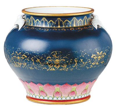 在展览的结尾,一件霁青金彩海晏河清尊引人注目。此器外壁施霁青色釉,以金彩绘缠枝牡丹、蕉叶纹、如意云纹等,近足部饰粉彩仰莲纹及联珠纹,肩颈之间雕贴一对白色展翅剪尾燕子作为耳。这件瓷尊是清代景德镇御窑为圆明园海晏堂烧制的陈设品,需多次入窑和施彩,工艺高超,集雕、贴、凸压之大成。此尊霁青色象征“河清”,燕与“晏”谐音,蕴含海晏河清、天下承平之意。