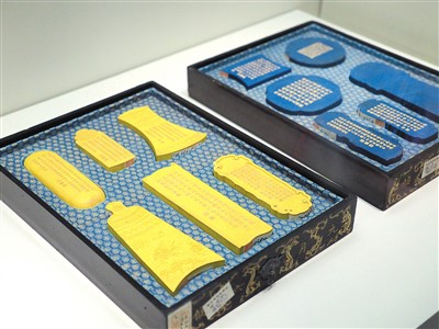 远古时代,黄河中下游地区的先民根据气候、四时交替总结出自然变化规律,用以指导日常生活、实现生产力进步。月令,即以四时为总纲、十二月为细目,以时记述天文历法、自然物候,并以此来安排生产生活的政令。展厅里的清乾隆“御制月令七十二候诗”彩色墨即是“顺天应时”文化传统的体现。此墨一套两匣,每匣6屉,每屉6锭,共计72锭,一锭墨对应一物候,大小不同、形状各异,有圆形、椭圆形、方形、六角形及叶式、碑式、琴式、钟式等。墨色分绿、红、白、蓝、黄5种,与中国传统五行相对应:春(正月、二月)为木,对应绿色;夏(四月、五月)为火,对应红色;秋(七月、八月)为金,对应白色;冬(十月、十一月)为水,对应蓝色;两季之交(三月、六月、九月、十二月)为土,意为激活、生发,对应黄色。