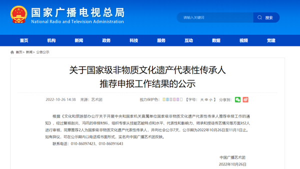 据国家广播电视总局官网10月26日消息,中国广播艺术团同意推荐冯巩、赵炎2人为国家级非物质文化遗产代表性传承人,并向社会公示7天,公示期为2022年10月26日至11月1日止。