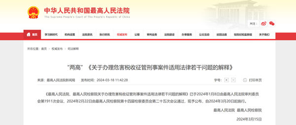 最高人民法院、最高人民检察院3月18日发布《关于办理危害税收征管刑事案件适用法律若干问题的解释》(以下简称《解释》)。《解释》共22条,聚焦新形势下如何有效与涉税犯罪作斗争,保障国家税收,维护税收秩序,促进市场主体自觉养成纳税习惯,积极推动经济社会高质量发展。