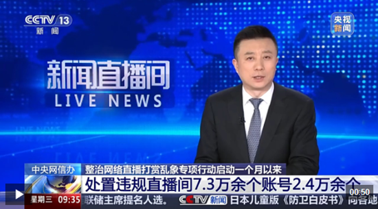“清朗·整治网络直播打赏乱象”专项行动启动一个月以来,中央网信办指导督促网站平台,紧盯低俗团播引诱打赏、虚假人设诱骗打赏、诱导未成年人打赏和刺激用户非理性打赏等突出问题,持续加大清理处置力度,完善打赏规则和管理制度,规范直播打赏营利行为。目前,已累计处置违规直播间7.3万余个、账号2.4万余个,指导网站平台发布治理公告和典型案例28期,严打一批大粉丝量主播账号,对各类打赏乱象行为形成震慑,娱乐团播等问题集中领域的生态面貌明显改善,攀比打赏和诱骗打赏等不良行为得到有力遏制,行业风气持续向好。