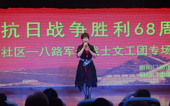 演出开始前,大屏幕播放了八路军老战士文工团摄制的专题片《爱国大业》。之后,团长焦歌发表讲话,他说:国共合作时期,于1937年8月,在国民党的一次高级会议上,宣布八路军正式成立。抗曰战争中,在中国共产党的领导下,八路军、新四军和各族人民英勇抗击倭寇,给侵略者以沉重打击,为抗战的胜利做出了重大贡献。八路军的平型关大捷和百团大战,对抗日战争的全面胜利起到了至关重要的作用。今天,世界政治格局变幻莫测,日本右翼势力又在蠢蠢欲动。我们今天走进社区举行庆祝纪念抗战胜利68周年文艺演出,就是为了让大家记住这段历史,每一名中华儿女都要居安思危,要深刻地意识到爱国教育刻不容缓。要时刻准备着听从祖国的召唤,听命党的指挥!为实现伟大的中国梦多做贡献!
