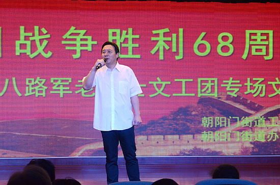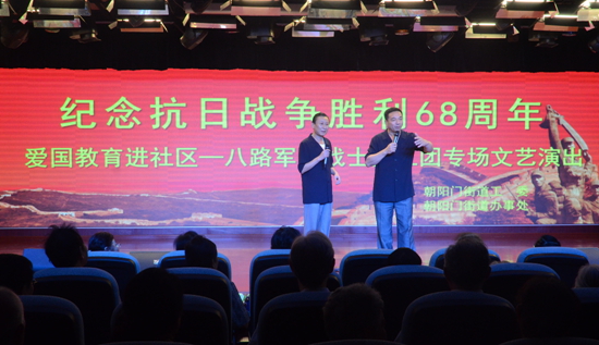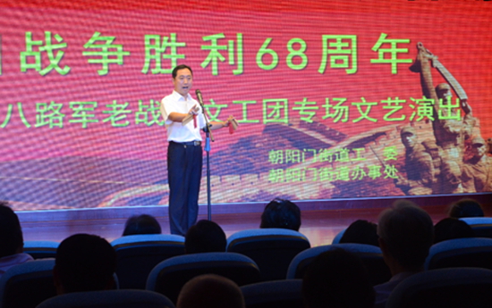 为大力弘扬爱国主义,9月3日下午八路军老战士文工团一行40余人,专程前往北京市东城区朝阳门街道办事处举行了——庆祝抗战胜利68周年爱国教育进社区专场文艺演出。中央国家机关老领导、八路军老战士文工团常务顾问:原全国大常委、中央文献研究室主任逄先知同志,原中共中央委员、中央宣传部部长王忍之同志,中国文联原副主席、书记处书记胡珍同志。还有名誉顾问王利军同志、中国文联副主席刘兰芳同志,焦歌团长,及北京市有关方面负责同志邵丽红、陈大鹏等出席观看了演出。