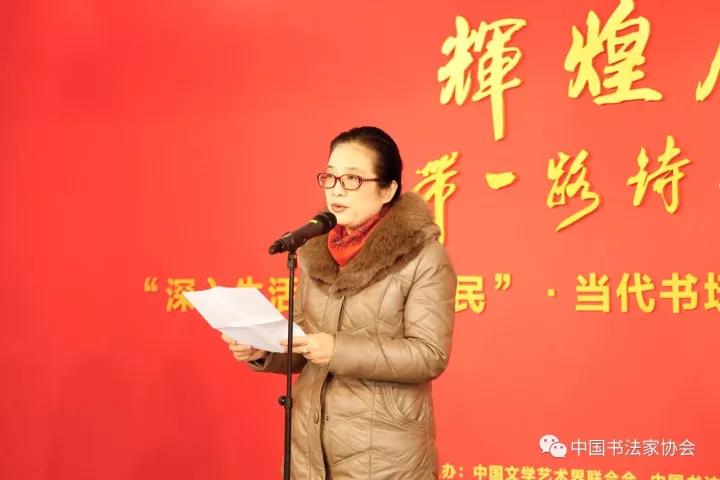 刘新科首先致辞。他说:由中国文联、中国书协、中国铁路文联主办的“辉煌历史:‘一带一路’诗书万里行”书法展览让大家亲眼目睹了党的十八大以来“一带一路”战略的发展建设成果,增强了爱党爱国之情;书法家受“一带一路”沿线各地区、各行业人民的感染与熏陶,丰富了见识,锤炼了作风,激发了灵感;与此同时,也在为沿线地区人民群众和一线职工送书法、送文化的过程中,更加坚定了扎根人民、服务基层的信心,努力创作更多讴歌祖国、讴歌新时代的书法精品。