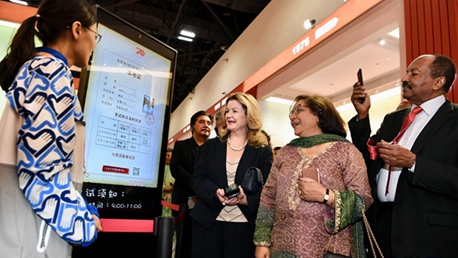 外国驻华使节参观庆祝中华人民共和国成立70周年大型成就展