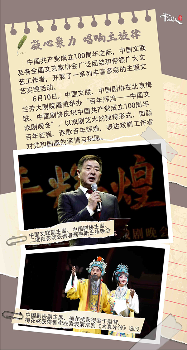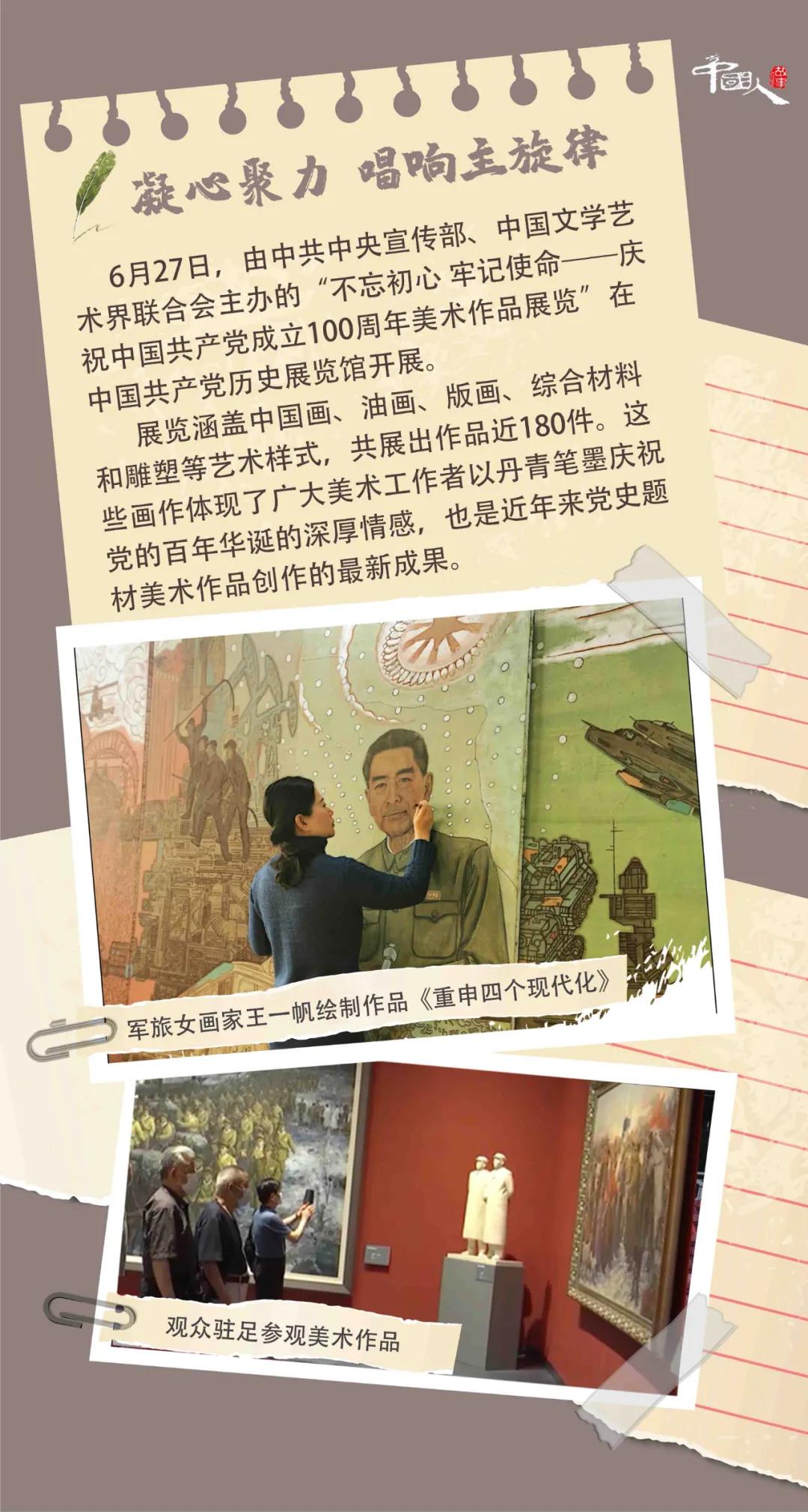“领航!伟大的中国共产党!”2021年6月28日,庆祝中国共产党成立100周年大型文艺演出举行,广大文艺工作者用文艺的形式回顾了党的百年辉煌历程,展示了奋进新时代的信心。2021年6月18日,随着中国共产党历史展览馆落成开馆,历时3年的中国共产党历史展览馆重大主题雕塑工程和“不忘初心 继续前进——庆祝中国共产党成立100周年大型美术创作工程”完美收官,这是新中国美术史上规格最高、规模最大、参与创作人员最多的雕塑工程和美术创作工程,是以美术创作反映党的百年光辉历程的重要成果,是中国美术家向党的百年华诞献上的艺术厚礼。