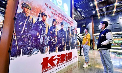 两名年轻人在北京一家影院观看电影《长津湖》的海报。新华社发