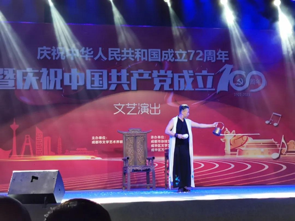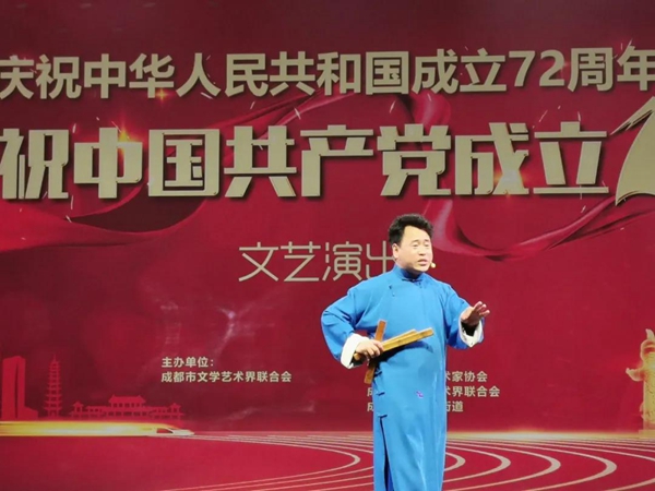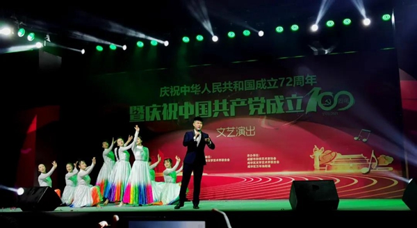 3月25日晚,“庆祝中华人民共和国成立72周年暨庆祝中国共产党成立100周年文艺演出”在成华区万年场街道槐树店社区成功举办。演出由成都市文学艺术界联合会主办,成都市杂技艺术家协会、成都市成华区文学艺术界联合会、成都市成华区万年场街道承办。