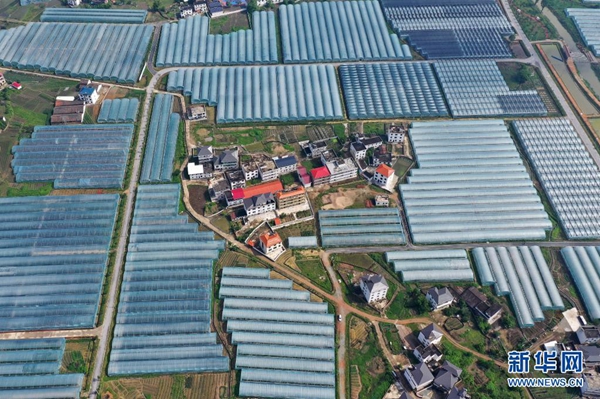 初夏时分的梓山镇潭头村,现代化标准蔬菜大棚鳞次栉比,白墙黛瓦、绿树成荫,清池塘、景观亭点缀其间……