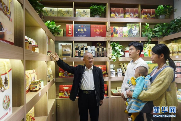 江西省赣州市于都县梓山镇潭头村村民孙观发(左一)向游客介绍当地的特色农产品(2020年10月21日摄)。新华社记者 万象 摄