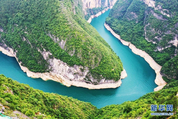 这是2020年5月26日拍摄的重庆市巫山县鱼头湾景象(无人机照片)。长江经济带沿江11省市大力推进生态环境整治,“共抓大保护、不搞大开发”,共同舞动高质量发展的“绿色长龙”。新华社记者 王全超 摄