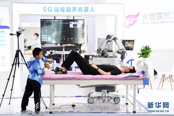 5月27日,参会者在“数博会”上体验5G远程超声机器人诊疗。新华社记者 杨文斌 摄