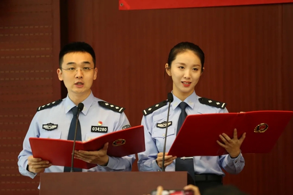 公安青年文艺骨干代表刘泰斗、朱紫一宣读倡议书