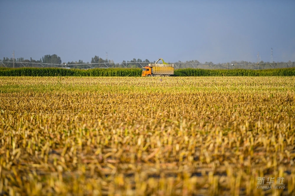 ↑内蒙古鄂尔多斯市达拉特旗展旦召苏木的农民使用大型机械收获青贮玉米,为当地养殖业提供优质饲料(2021年9月26日摄)。近年来,达拉特旗通过实施粮改饲项目,调整农业种植结构,引导农民种植青贮玉米,助力农民增收。