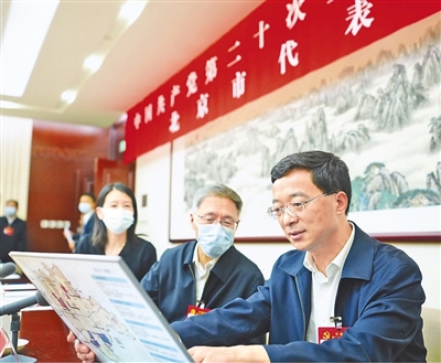 10月17日,在北京代表团举行的分组会议上,北京市大兴区委书记王有国代表(右一)精心准备图板,