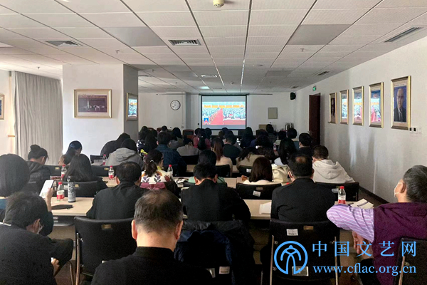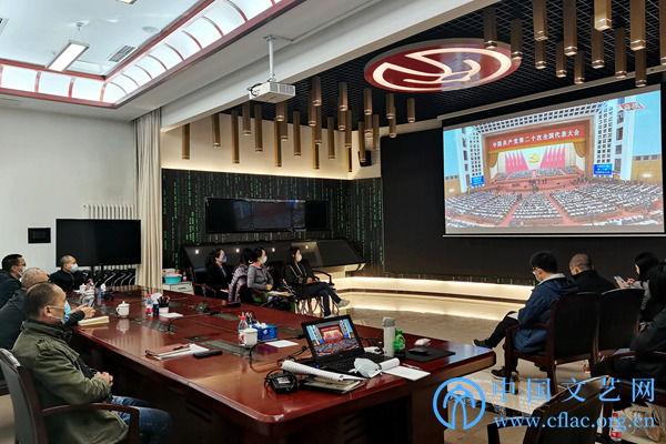 10月16日上午,中国共产党第二十次全国代表大会在北京隆重开幕,习近平总书记代表第十九届中央委员会向大会作报告。图为中国民间文艺家协会组织全体党员和干部职工收听收看党的二十大开幕会直播盛况。