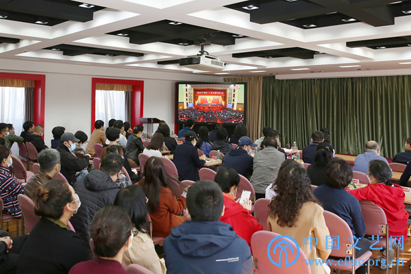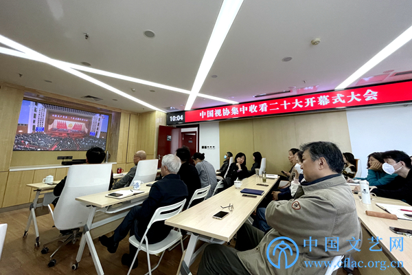 10月16日上午,中国共产党第二十次全国代表大会在北京隆重开幕,习近平总书记代表第十九届中央委员会向大会作报告。图为中国文联机关各部门组织全体党员和干部职工收听收看党的二十大开幕会直播盛况。 中国文艺网 高森 摄