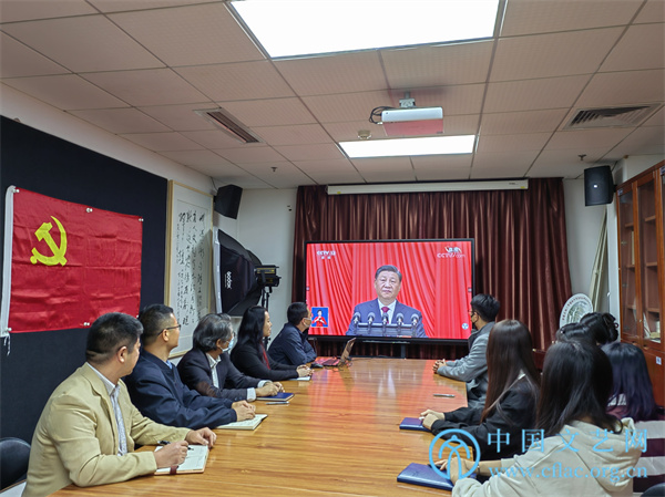 10月16日上午,中国共产党第二十次全国代表大会在北京隆重开幕,习近平总书记代表第十九届中央委员会向大会作报告。图为中国文联机关服务中心组织全体党员和干部职工收听收看党的二十大开幕会直播盛况。