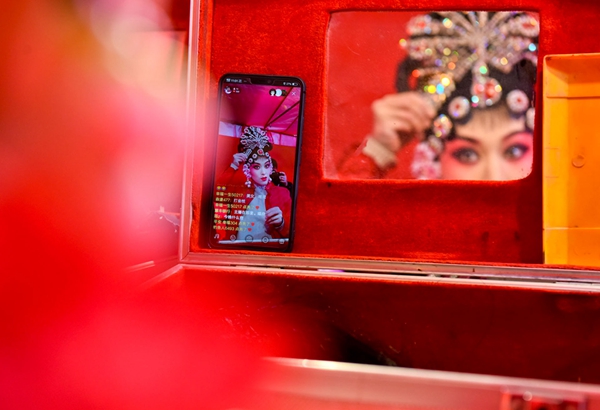 直播的蒲剧演员——2018年12月15日山西永济,一位青年蒲剧演员,一边化妆一边用手机网络直播。