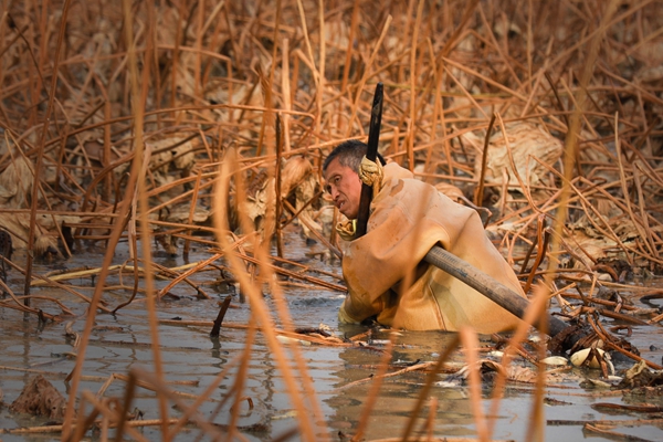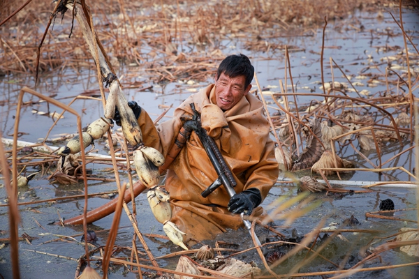 黄河滩涂收莲菜——手拿水枪穿着厚厚防水衣的挖藕人。运城 张满成 摄