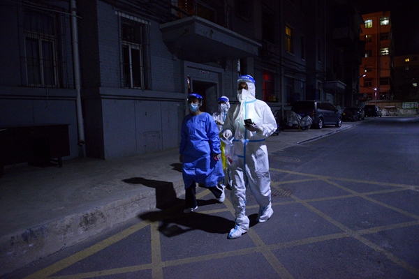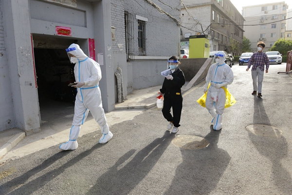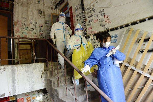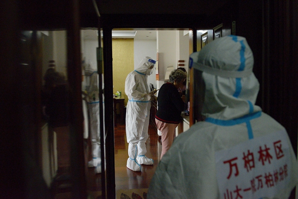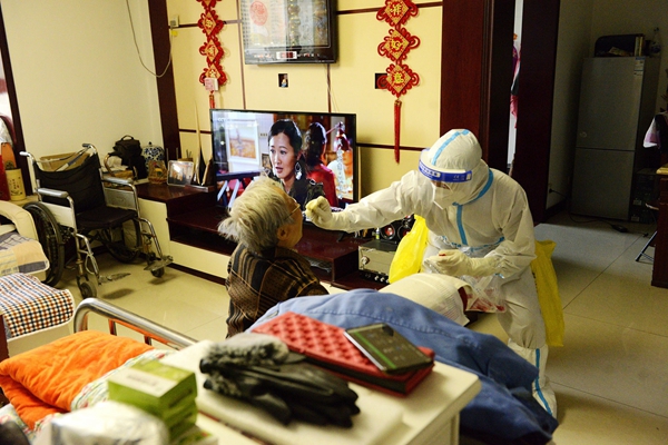 上门核检医护有爱——2022年4月太原万柏林义井东社区因抗疫需核酸检测,有行动不便者无法出门,医护和志愿者上门为其进行检测取样。太原市 郝仁喜 摄