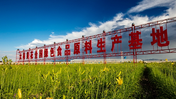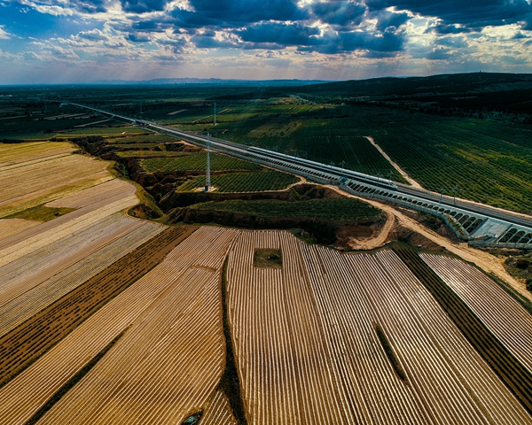 复兴号从习近平总书记考察过的大同云州区有机黄花标准化种植基地边奔弛而过。大同市 任彦龙 摄