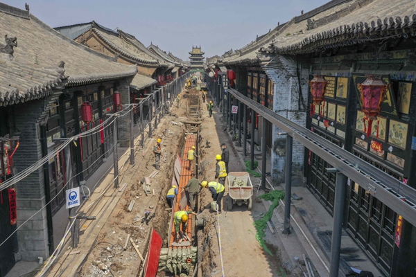 烟火古城——2022年4月16日,工人在平遥古城南大街基础设施提升改造工地施工。