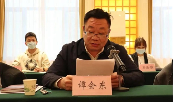 图为兵团诗词楹联家协会副主席、秘书长谭会东交流发言。
