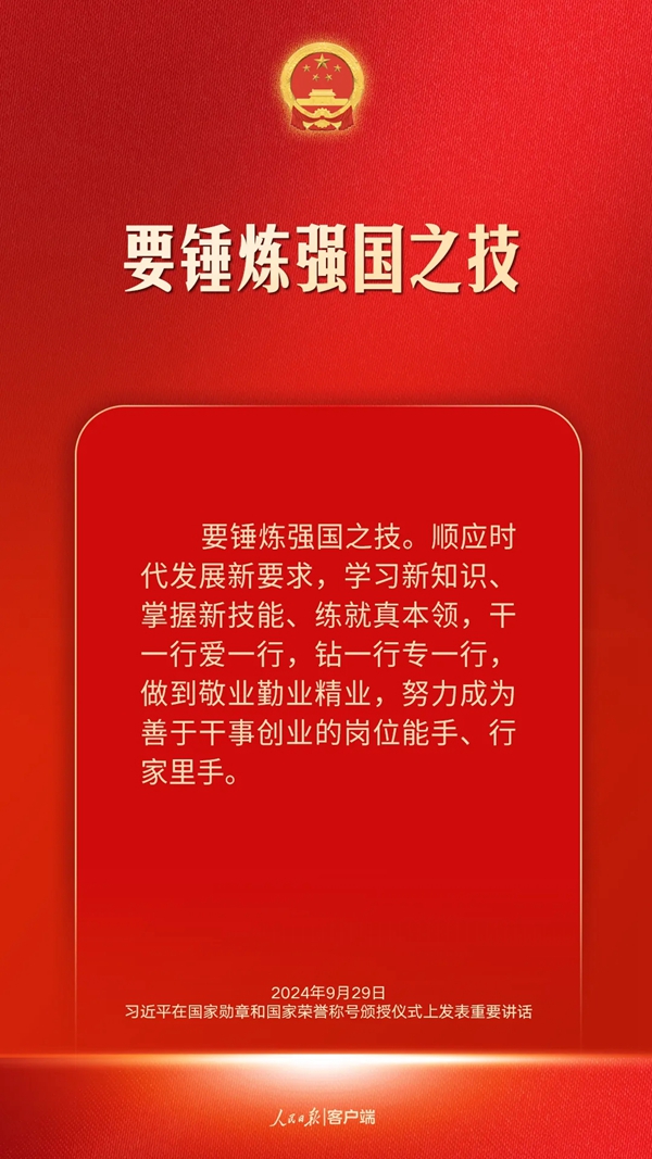 “要锤炼强国之技。顺应时代发展新要求,学习新知识、掌握新技能、练就真本领,干一行爱一行,钻一行专一行,做到敬业勤业精业,努力成为善于干事创业的岗位能手、行家里手。” 9月29日,习近平总书记在中华人民共和国国家勋章和国家荣誉称号颁授仪式上发表重要讲话强调,要锤炼强国之技。这对全党全国各族人民以英雄模范为榜样、在新时代新征程上提升能力本领提出了明确要求,寄予了殷切希望。