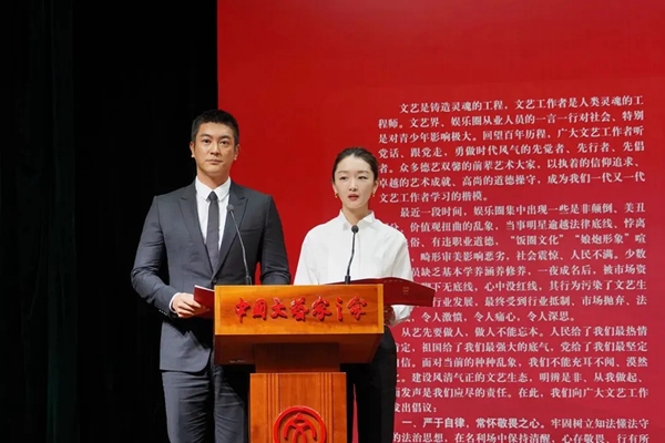 青年演员周冬雨、杜江宣读《修身守正 立心铸魂——致广大文艺工作者倡议书》
