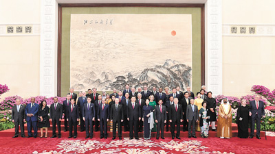 4月26日,国家主席习近平和夫人彭丽媛在北京人民大会堂举行宴会,欢迎出席第二届“一带一路”国际合作高峰论坛的外方领导人夫妇及嘉宾。这是习近平和彭丽媛同外方领导人夫妇及嘉宾合影留念。新华社记者 谢环驰摄