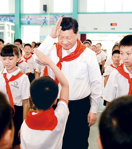 2014年5月30日上午,中共中央总书记、国家主席、中央军委主席习近平来到北京市海淀区民族小学,参加庆祝“六一”国际儿童节活动。这是习近平参加少先队入队仪式。 新华社记者 李涛/摄