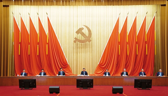 中国共产党第十九届中央委员会第六次全体会议,于2021年11月8日至11日在北京举行。这是习近平、李克强、栗战书、汪洋、王沪宁、赵乐际、韩正等在主席台上。 新华社记者 谢环驰/摄