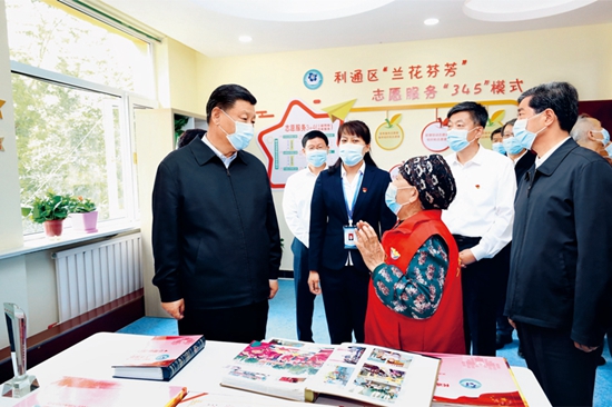 2020年6月8日至10日,中共中央总书记、国家主席、中央军委主席习近平在宁夏考察。这是6月8日下午,习近平在吴忠市利通区金花园社区党群活动服务中心,同社区志愿者代表亲切交谈。 新华社记者 鞠鹏/摄