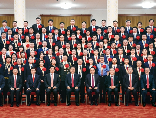 2021年6月29日,庆祝中国共产党成立100周年“七一勋章”颁授仪式在北京人民大会堂金色大厅隆重举行。习近平等领导同志在颁授仪式前会见全国“两优一先”表彰对象。 新华社记者 申宏/摄