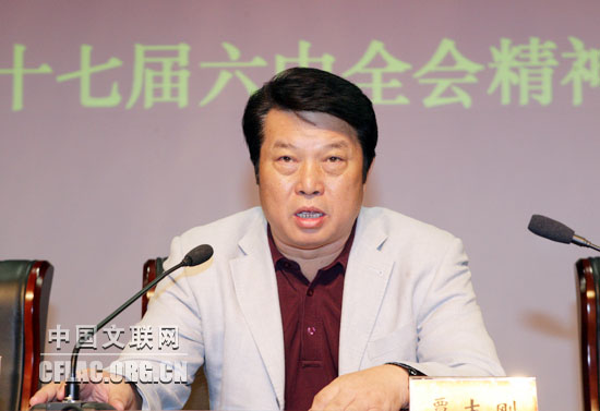 10月19日,中国文联召开大会,传达贯彻党的十七届六中全会精神。图为中国文联党组副书记、副主席覃志刚传达中央领导同志在十七届六中全会上的重要讲话精神。中国文联网 孟祥宁 摄