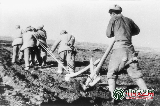 当年二军某部队进驻疏勒县草湖,人拉木犁开荒