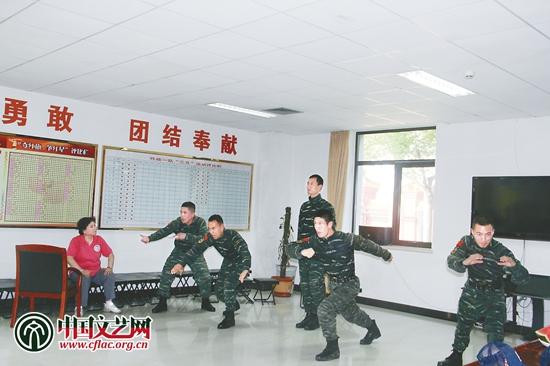 “报告老师,舞蹈队应到53人,实到53人,请指示!”没错,这铿锵有力的报告声是来自武警特种警察学院猎鹰突击队一群血气方刚拿着冲锋枪的小伙子,这可给前来为他们授课的舞蹈家山翀、刘岩这两个“弱女子”出了个难题。“真是挺意外,我以为是给女兵教舞蹈呢,不过没有关系,我一定会倾尽所有教大家,我们相互学习。”刘岩说。艺术家和官兵在相互认识之后,很快就进入了互动环节。