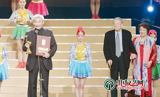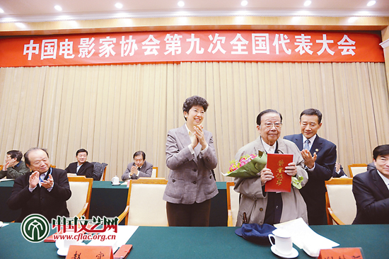 中国影协第九次全国代表大会上,中国文联党组书记、副主席赵实为著名导演谢铁骊颁发名誉主席证书