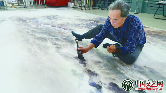 2016年9月,由宋雨桂领衔主创的《中华文明历史题材美术创作工程》入选作品《黄河雄姿》的创作进入最后阶段。宋雨桂先生带着助手遍寻当今各类表现黄河题材的绘画形式,技法参考,尝试多种表现水的手法,矢志画出黄河新意。他们数度推敲反复,五易其稿,最终定稿以中近景特写表现天上来之黄河“水”,以凸显黄河奔腾激越之气势。此时工程作品已陆续集稿,一丝不苟的宋雨桂先生,抱病亲自操刀动笔创作,从发来的电子图片中看到宋雨桂先生全身趴着、跪着濡墨挥写的情景,令人动容。巨大尺幅的作品在先生的连续奋战下如期完成、装裱,运抵中国国家博物馆,并在全国第十次文代会期间向首都公众展出。作品以恣意纵横、舒卷挥洒的写意笔调将黄河奔泻而下、浪花跳跃表现得出神入化,近观通透而大气浑成,远视厚重又具扑面的倾压之感,令人宛若置身激流之中,其轰鸣之声振聋发聩。作品融具意象、抽象一炉,写实写意两相得宜,恰如其分的技术掌控获得了验收专家的高度好评和观众的广为赞誉。作品如愿入藏中国国家博物馆,并将悬挂于殿堂之中。《黄河雄姿》成为了宋雨桂艺术创作的巅峰之作和泣血绝笔之作,撂下画笔的宋雨桂先生便累倒在病榻之上,自作品2016年11月20日展出至他今年5月15日去世仅半年。令我至今想起便觉得愧疚不安的是,没有制止他的倾情投入,没有顾及到劳累给他带来的健康侵害。他的自信和执拗秉性让他全然不顾亲人和学生的劝阻,这或许与他性格中的刚强自尊有关,但我终无法为之释然而成为心中之痛。